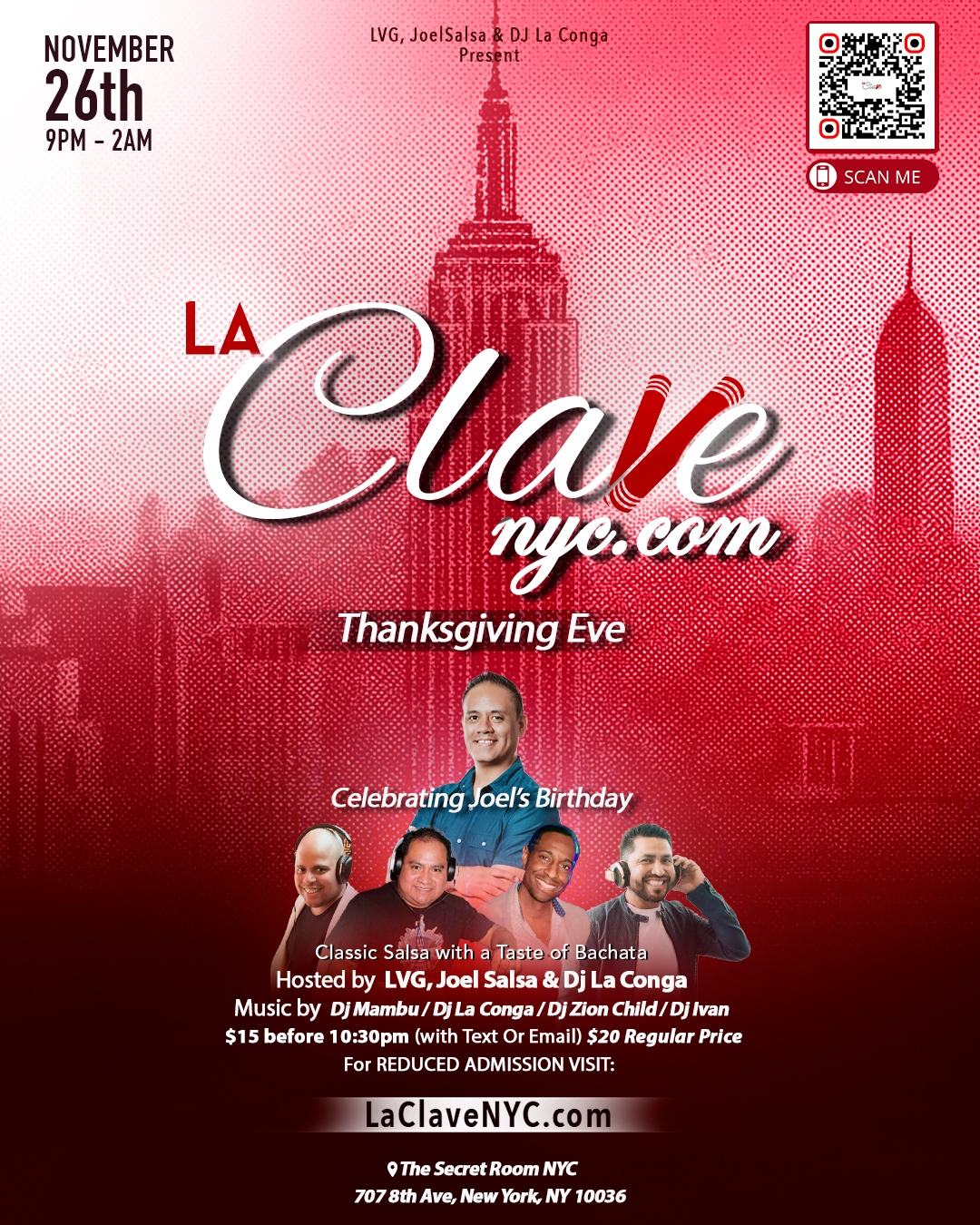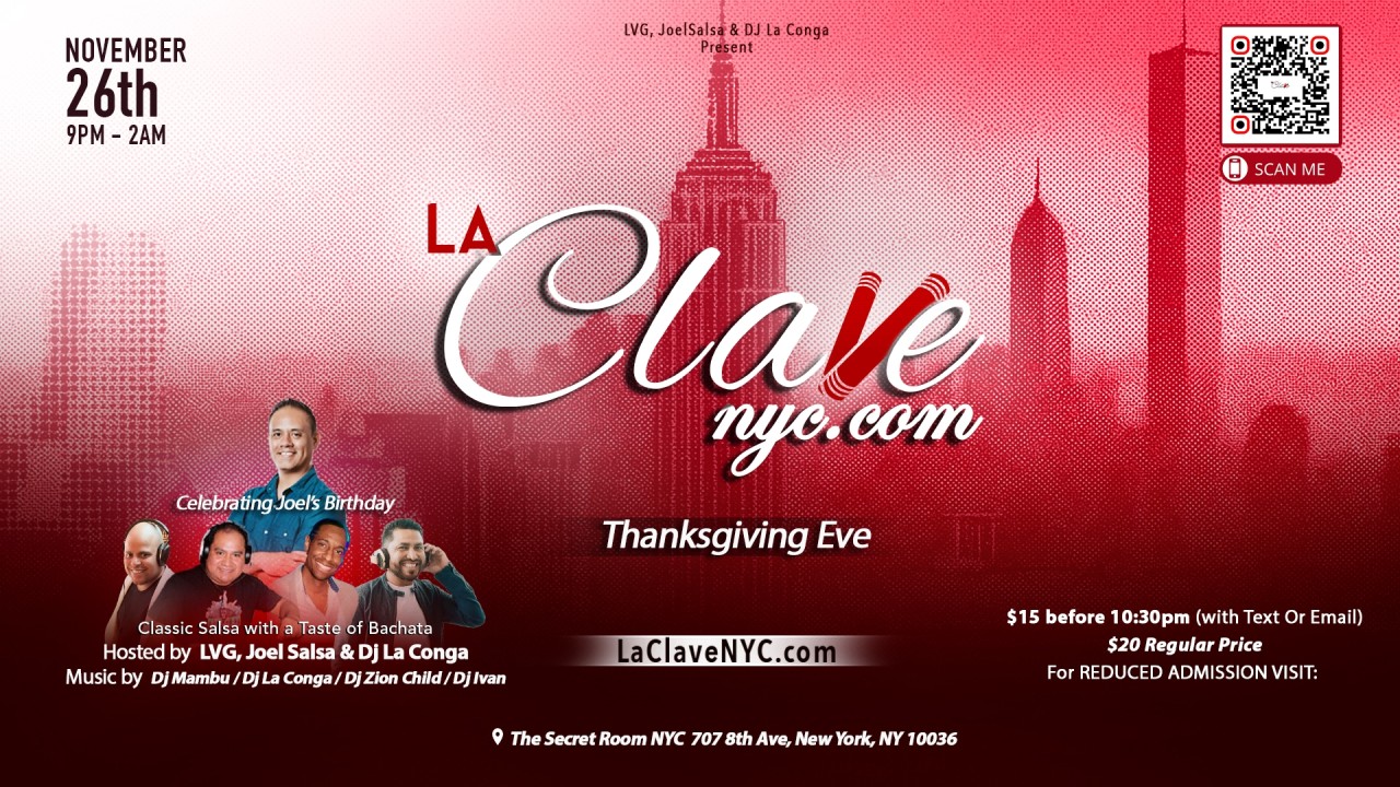 Hosted by:LVG, JoelSalsa & DJ La CongaMusic by:DJ La Conga, DJ Ivan, DJ Mambu & Dj Zion ChildPrice:$20 General Admission$15 BEFORE 10:30PM(with Text or Email)